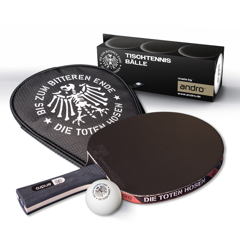 Jetzt als Bundle: Der Toten-Hosen-Tischtennisschläger kommt zusammen mit passender Schlägerhülle und offiziellen Bällen (3er-Set) von andro. Perfekt für Einsteiger und Hobbyspieler: der RAPIDO 3000 bietet hohe Ballkontrolle, Topspin und Rotation. Stylisch, praktisch und ready für Rundlauf oder Wettkampf – mit Bandlogo und ikonischem Knochenadler!