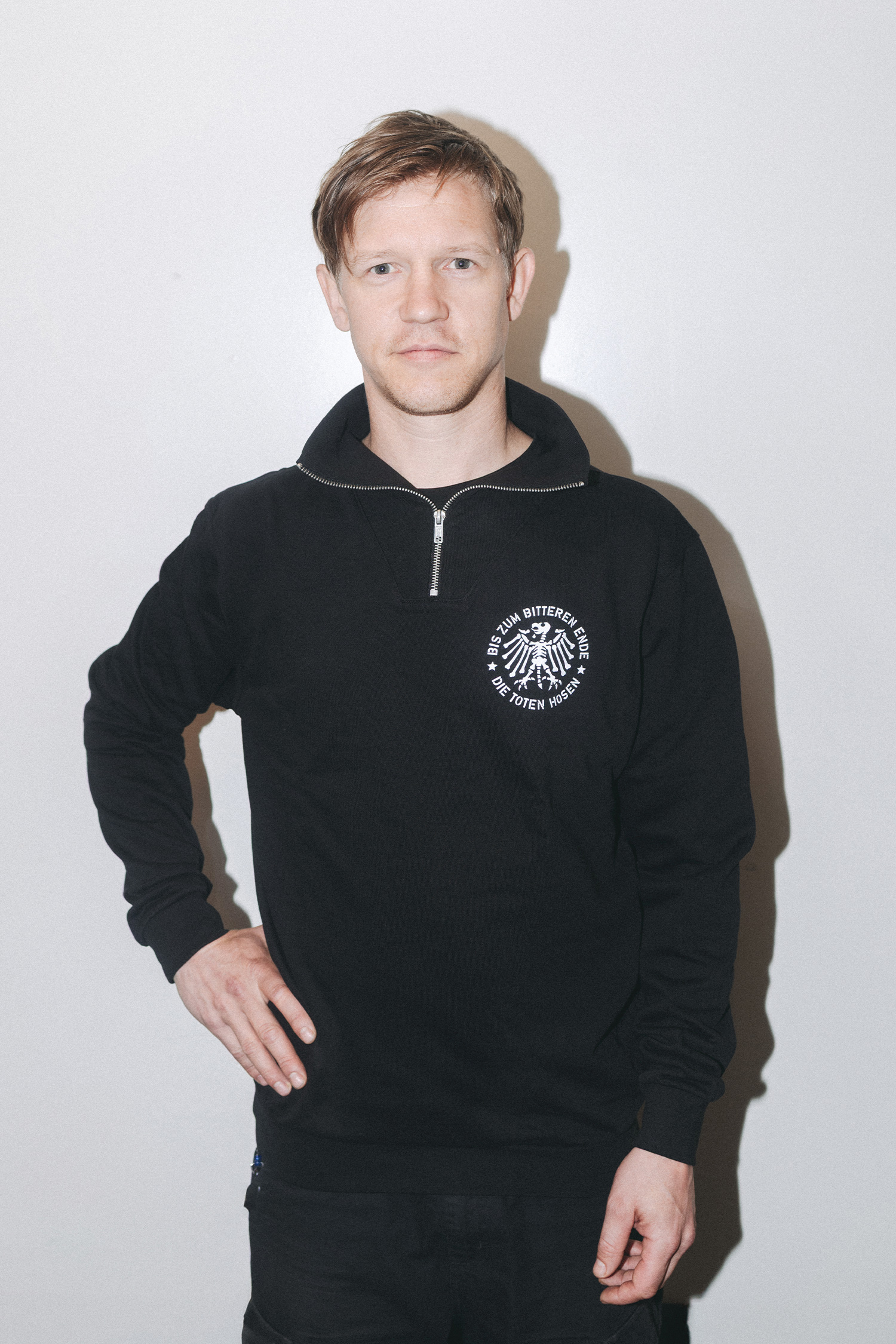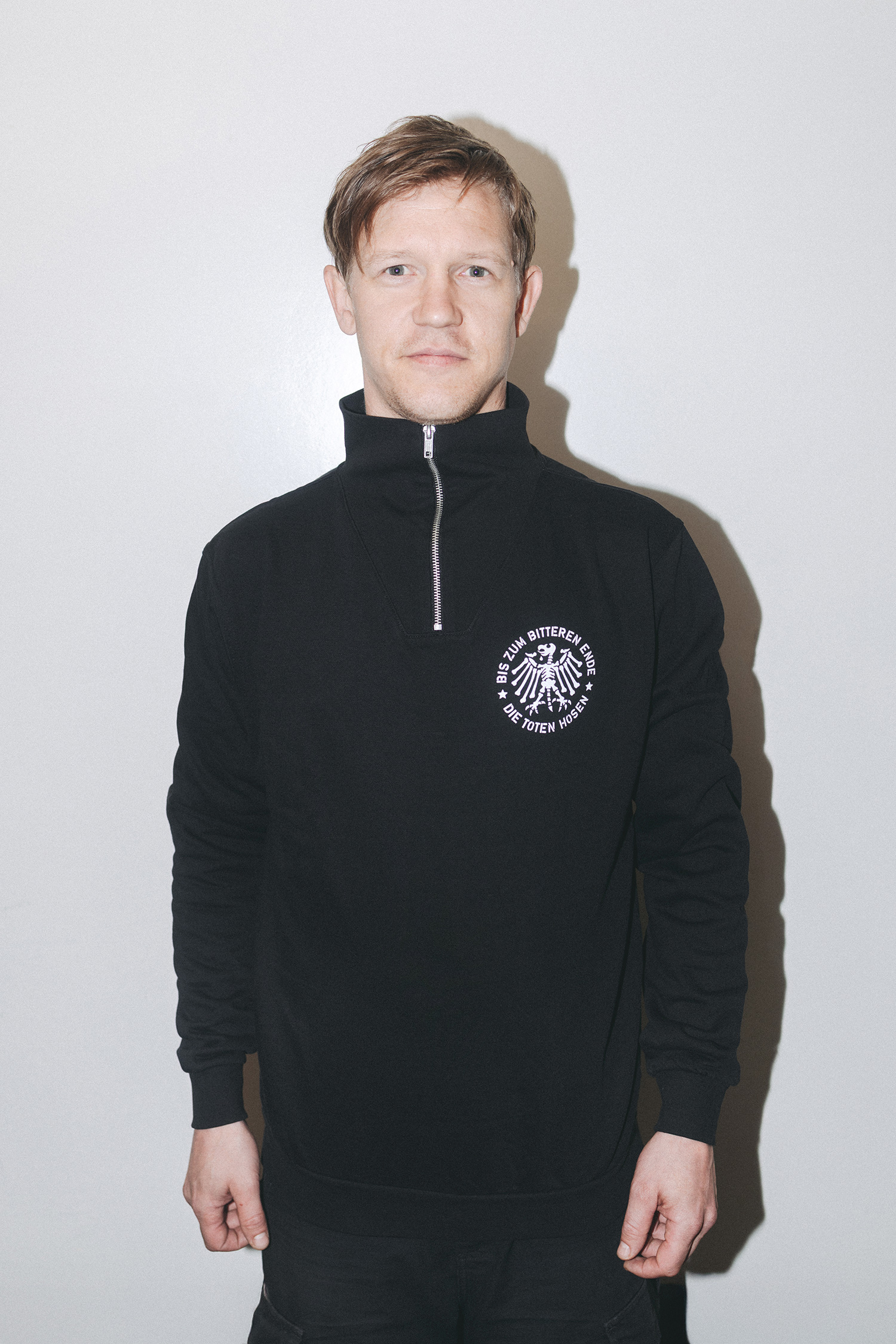 Das klassische Hosen-Logo mit Knochenadler und „Bis zum bitteren Ende“-Schriftzug wurde schon vielfach eingesetzt. Die neuste Idee: Eher dezent auf einem Pulli mit Zipper. Mit diesem Outfit wird das nächste Bewerbungsgespräch garantiert erfolgreich!